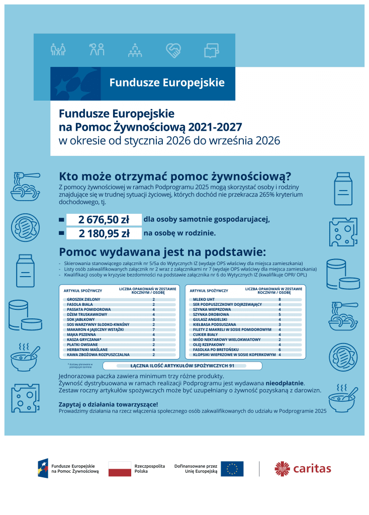 - Dostawy artykułów spożywczych do Organizacji Partnerskich Regionalnych rozpoczęły się w od lutego 2025 roku, a dystrybucja artykułów spożywczych do osób potrzebujących rozpoczęła się od końca lutego i potrwa do końca września 2025 r.